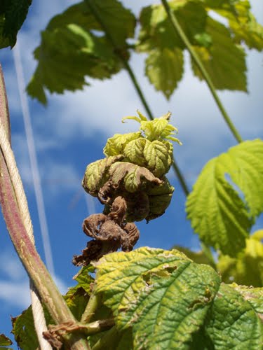 The weekend is here - and perhaps that means a nice cold beer or two. One of the main ingredients in beer, of course, is hops, which give brews their characteristic bitter flavor. Hops are dried flowers of the Humulus lupulus plant. Pseudoperonospora humuli is a parasite that could get in the way of your thirst-quenching IPA or ESB, however. This fungus, known as downy mildew infects hop plants and destroys their leaves and those wonderful flowers. A recent molecular phylogenetic study has suggested that P. humuli is not actually genetically distinct from Pseudoperonospora cubensis, another mildew fungus that was described from cucurbits (cucumbers, melons, etc.) So, if you're not a beer-drinker, but do like to enjoy a nice gherkin or melon ball as part your Saturday evening activities, well then, you can be annoyed at the very same parasite.