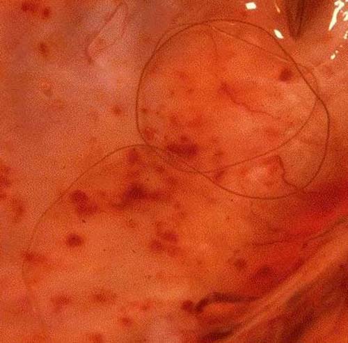 Parelaphostrongylus tenuis is a parasite of white-tailed deer that lives in the meningeal spaces of a deer's brain and is thus known as "brainworm". Female worms lay eggs that make their way to the lungs via the blood. There, the eggs hatch into first-stage larvae, get coughed up, swallowed, and then passed out. Snails or slugs then come along and are infected by the larvae, which penetrate the foot of the gastropod. Eventually, the nematode makes its way back into a deer, when they are ingested by the browsing deer. The worms penetrate the stomach, make their way to the spinal cord, and then follow this up to the brain to begin the cycle again. As far as we know, the worms don't seem to have a great effect on white-tailed deer, though I suppose they're not known for being particularly smart animals anyway. However, if the worms find themselves in other hosts such as moose, llamas, or goats, the effects can be very severe. In these hosts, the worms cause uncoordination, stumbling and aimlessness, a condition that is very often fatal. Image comes from this site.