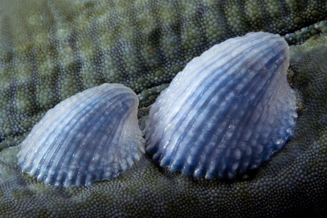 Thyca crystallina is a tiny little limpet mollusc that lives on and sucks the "blood" - the hemolymph - out of blue sea stars (Linckia laevigata). The females of this species can become permanently attached to the exoskeleton of the echinoderms and just live their happily, feeding - oh and mating - with a tiny little male, one-tenth their size, that just lives in their shells and fertilizes her eggs. One might say that they are sort of a "tick of the sea" (oh, this really ought to confuse Jessica Simpson). The image comes from this site.